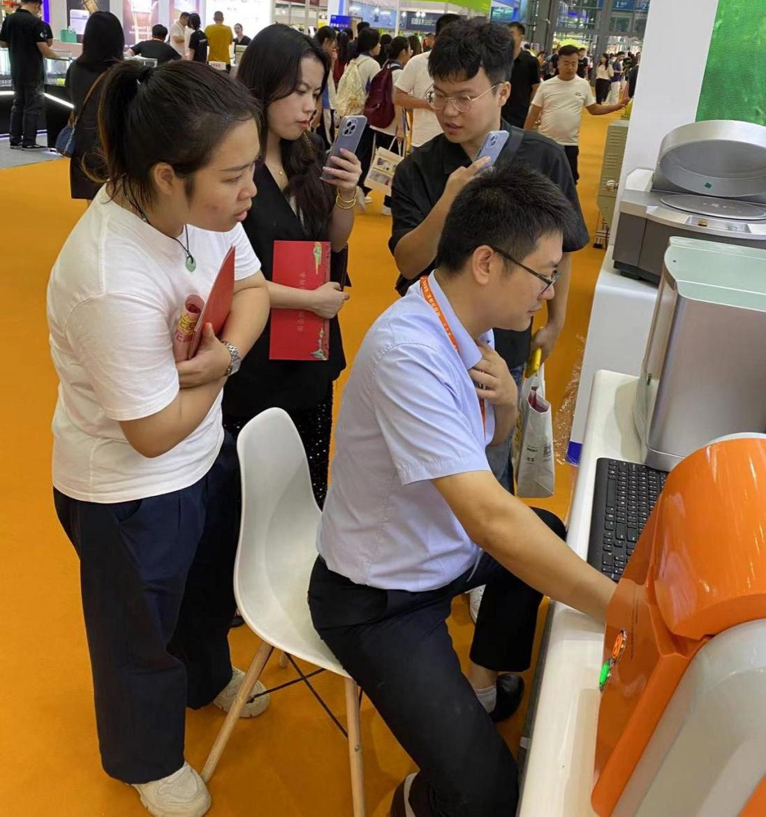 天瑞医疗仪器股东长刘召贵博后赶赴展会信息车间(左一)