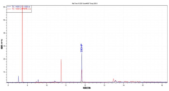 样机TIC图(红色)与邻苯混标TIC图(乳白色)