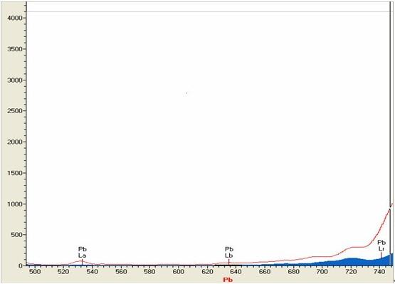 所示实谱特征纯铜rc101(Pb,0ppm)即本底、黄白色虚谱为 镍白铜313(Pb:60ppm)