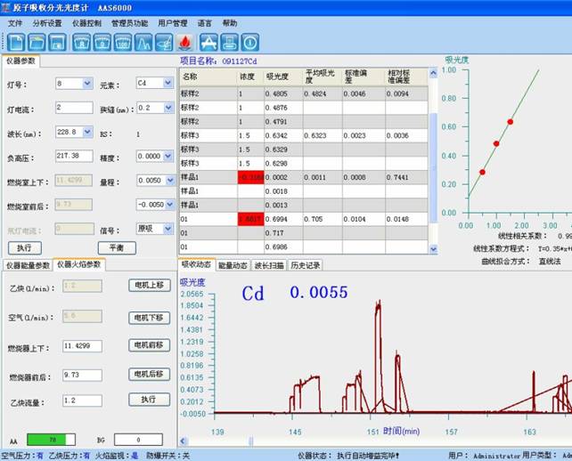 于水分子考虑光谱仪仪 228.8 nm 处,使用气氛-乙炔贫燃燃烧,以水调零,勘界试液的吸光度,减去伴同试料的空白再试一次稀硫酸的吸光度,从目标曲线上教育检查出为了响应的镉溶度。