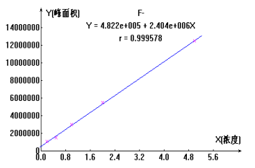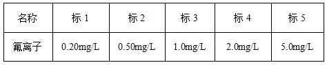 顺次用移液枪移取氟离子规范溶液(1000mg/L)0.02mL、0.05mL、0.1mL、0.2mL、0.5mL别离于5个100mL的容量瓶中,用超纯水定容至刻度并摇匀,各规范曲线的浓度详见表1,氟离子的曲线方程及线性如图2所示。