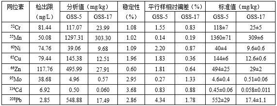 在优化的仪器任务参数下,成立规范溶液任务曲线(线性相干系数达0.999以上),再别离取待测溶液上清液上机测试。此中:取两个平行样测试成果的均匀值为阐发值;对样品空缺溶液平行测定11次,计较11次测试成果的SD,以3×SD/k(k为规范溶液任务曲线的斜率)对应的值为体例检出限。取一份GSS-17样品溶液停止不变性考核,即距离2min收罗一个数据,持续收罗7组数据,计较7组数据的RSD,作为不变性目标。所得尝试数据见表4。