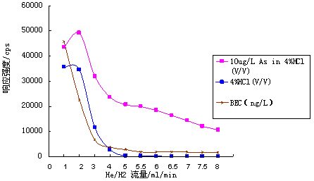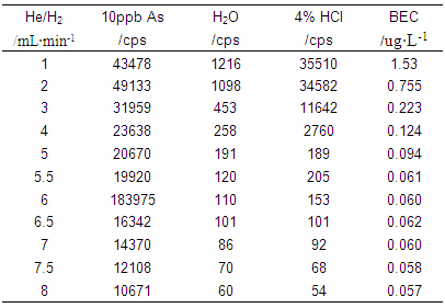 仪器起首在规范形式下停止参数优化(操纵10μg·L-1的Li、Co、In、U、Ce调谐液对仪器任务参数停止调理,使仪器活络度🌠高,同时氧化物及双电荷产率小于3%);再开启He/H2碰撞反映气,慢慢增大He/H2流量,测试超纯水、4%HCl及10μg·L-1 As(4%HCl介质)在75amu处的呼应旌旗灯号,计较其背景等效浓度(具体数据见表1及图1);并操纵As标液进一步优化He/H2流量,获得🍸仪器任务参数如表2所示。