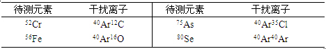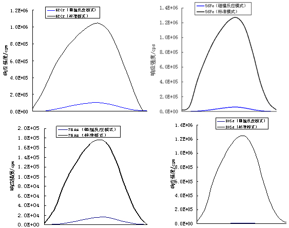 今朝四极杆电感耦合等离子体质谱仪多接纳氩气等离子气,则氩原子与基体离子连系构成多原子离子,看待测元素同位素形成搅扰,具体搅扰见表3。设置装备摆设10μg·L-1的Cr(3%HAc介质)、Fe(1%HNO3介质)、As(4%HCl介质)、Se(1%HNO3介质)规范溶液,别离在规范形式及碰撞反映形式下测定其同位素呼应旌旗灯号(图2),尝试成果同时显现56Fe与57Fe呼应强度靠近Fe同位素品貌比,52Cr与53Cr呼应强度靠近Cr同位素品貌比(57As及80ﷺSe无适合参考同位素), 由上述可知,ICP-MS 2000E接纳He/H2作为碰撞反映气体,能有用去除氩基相干多原子离子搅扰。