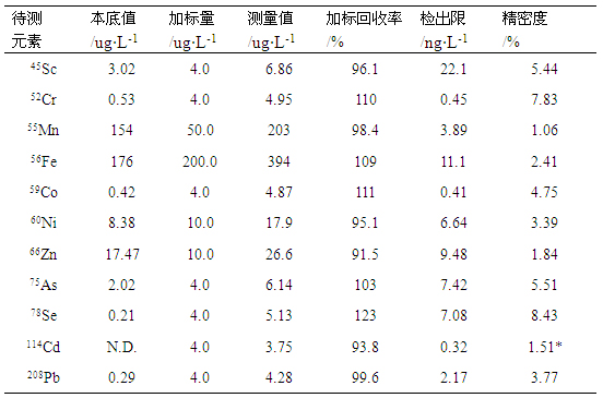 在仪器优化任务参数前提下,对样品溶液及加标样液停止测试,计较其加标收受接管率;对样品空缺溶液平行测定7次,以三倍空缺旌旗灯号规范误差/活络度对应的浓度为检出限;同时对样品溶液平行测定11次(距离2min),计较其绝对规范误差,考查精密度,数据见表4。各元素检出限在0.41-22.07ng/L之间,加标收受接管率在93.82%-123.10%之间,精密度在1.06%-🦋8.43%之间。